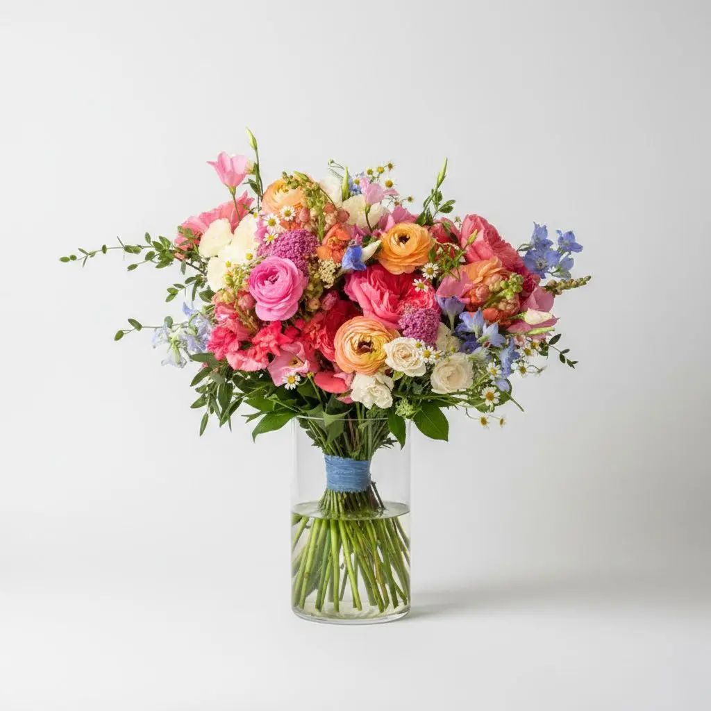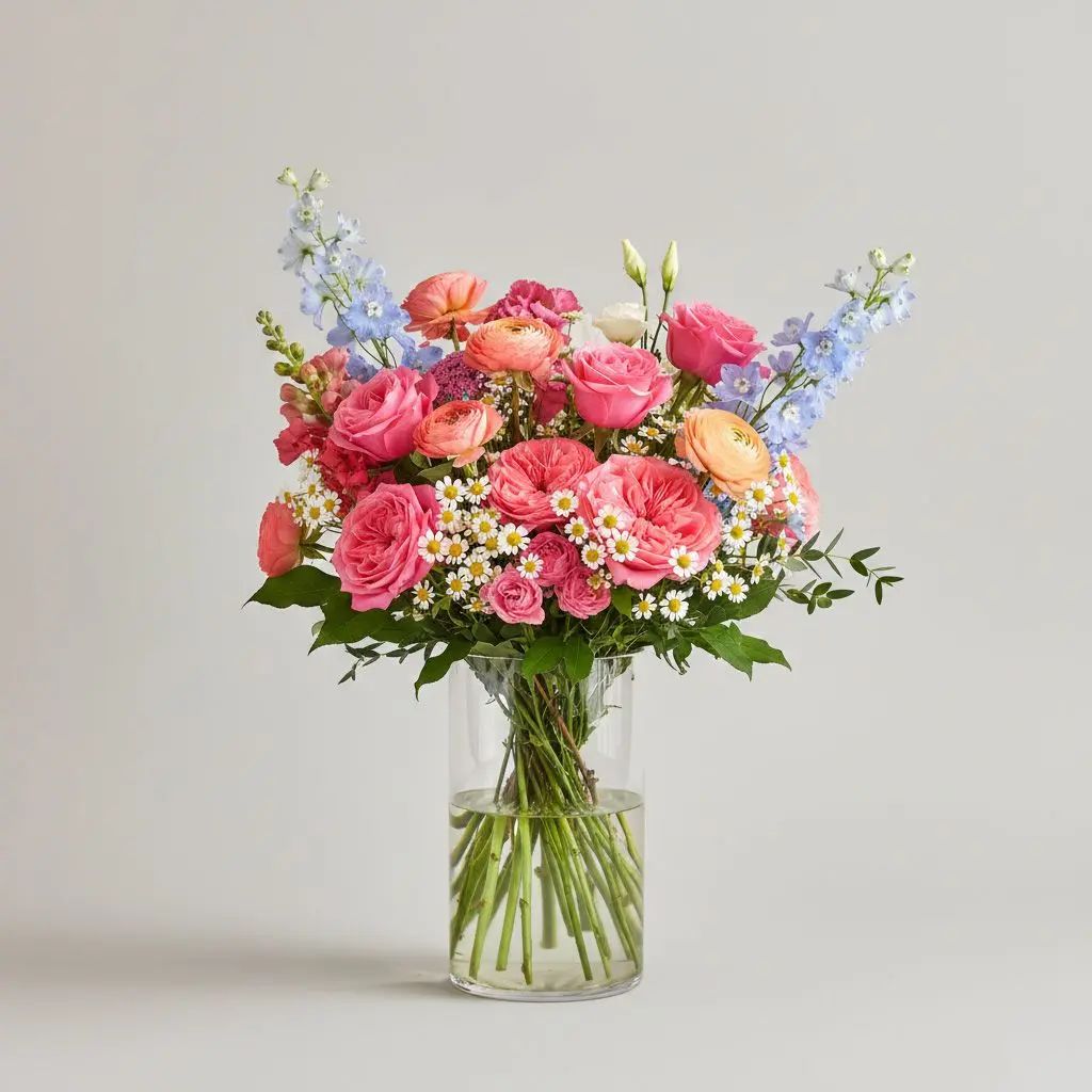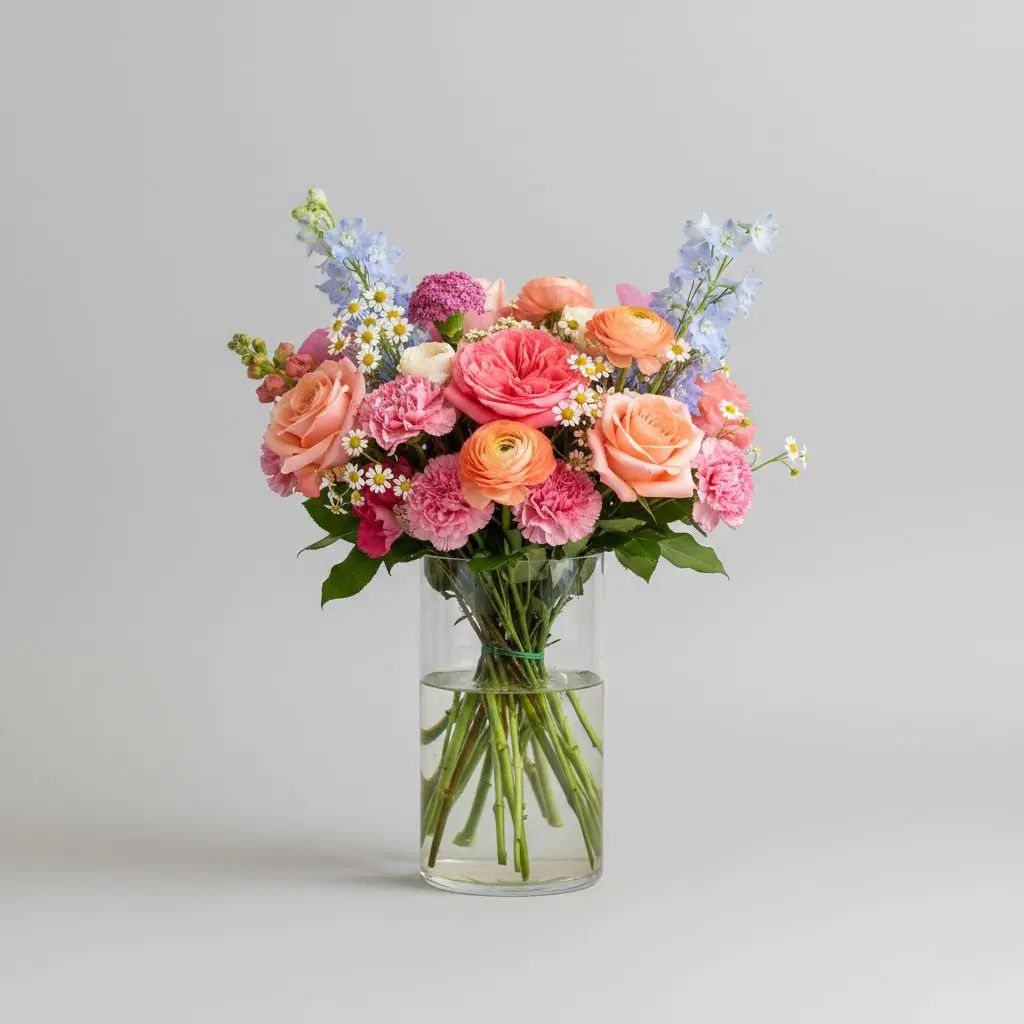 The Peach Blossom Dream bouquet brings spring's beauty with pastel peach roses, apricot ranunculus, pink carnations, delicate delphinium, and white feverfew. Perfect for any occasion, it radiates charm and elegance.