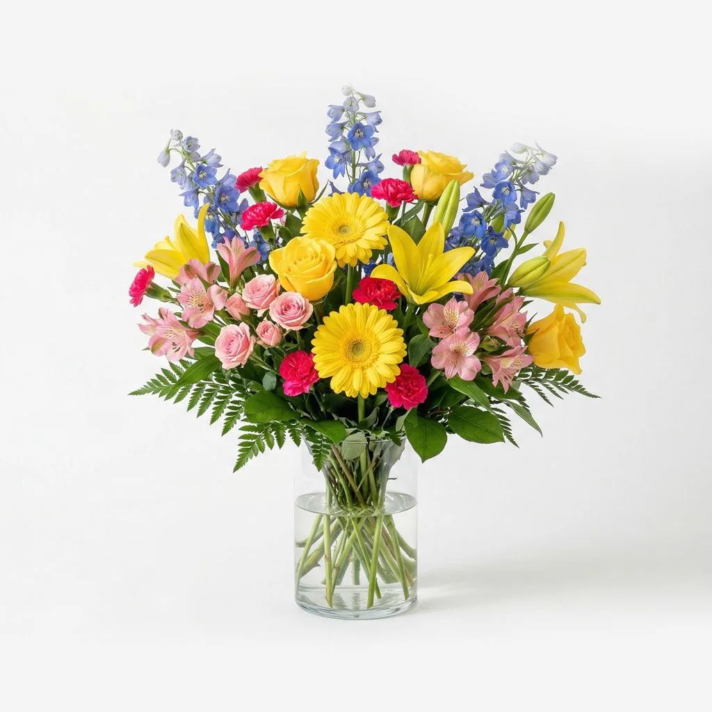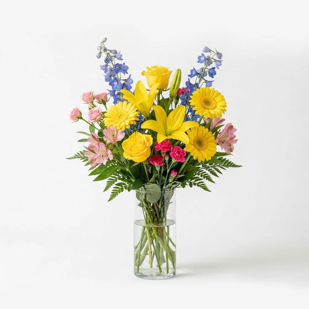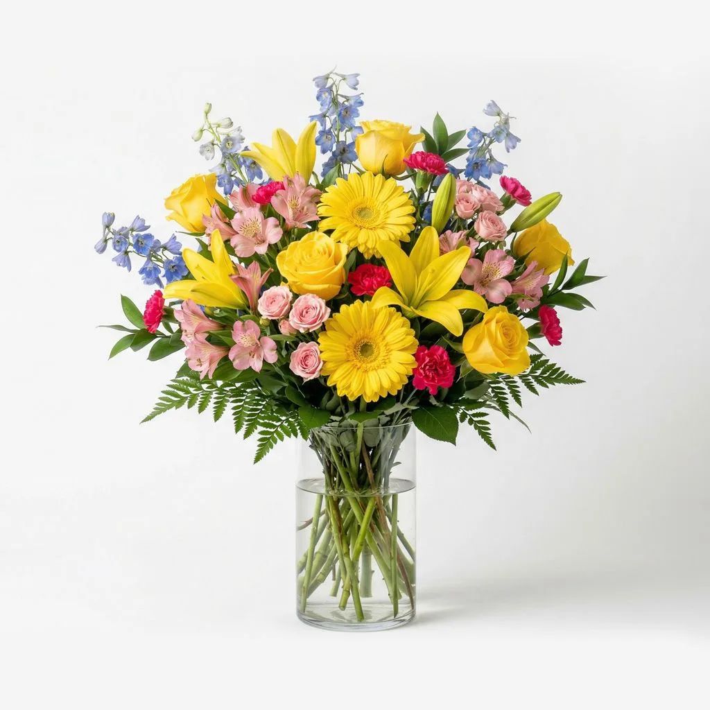 Golden Radiance Garden is a refined floral arrangement designed to bring warmth, light, and gentle beauty to any setting. Featuring vibrant yellow gerbera, roses, and Asiatic lilies as its focal blooms, this arrangement creates a bright and uplifting presence that symbolizes remembrance, honor, and enduring love.