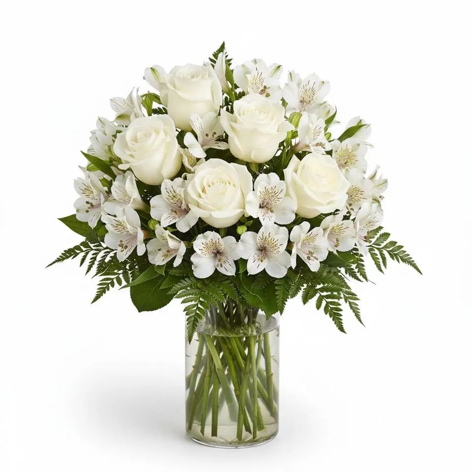 Experience the serene beauty of our Whispering Whites arrangement. This elegant bouquet features pristine white roses and graceful alstroemeria, creating a harmonious display of purity and tranquility. Perfect for brightening any space or gifting a touch of peace.